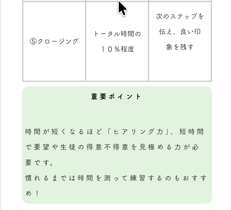もちろん生徒によって細かい部分は変わってきますが、成功、継続に繋がりやすい共通するポイント、流れを詳細にご説明しています。
